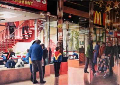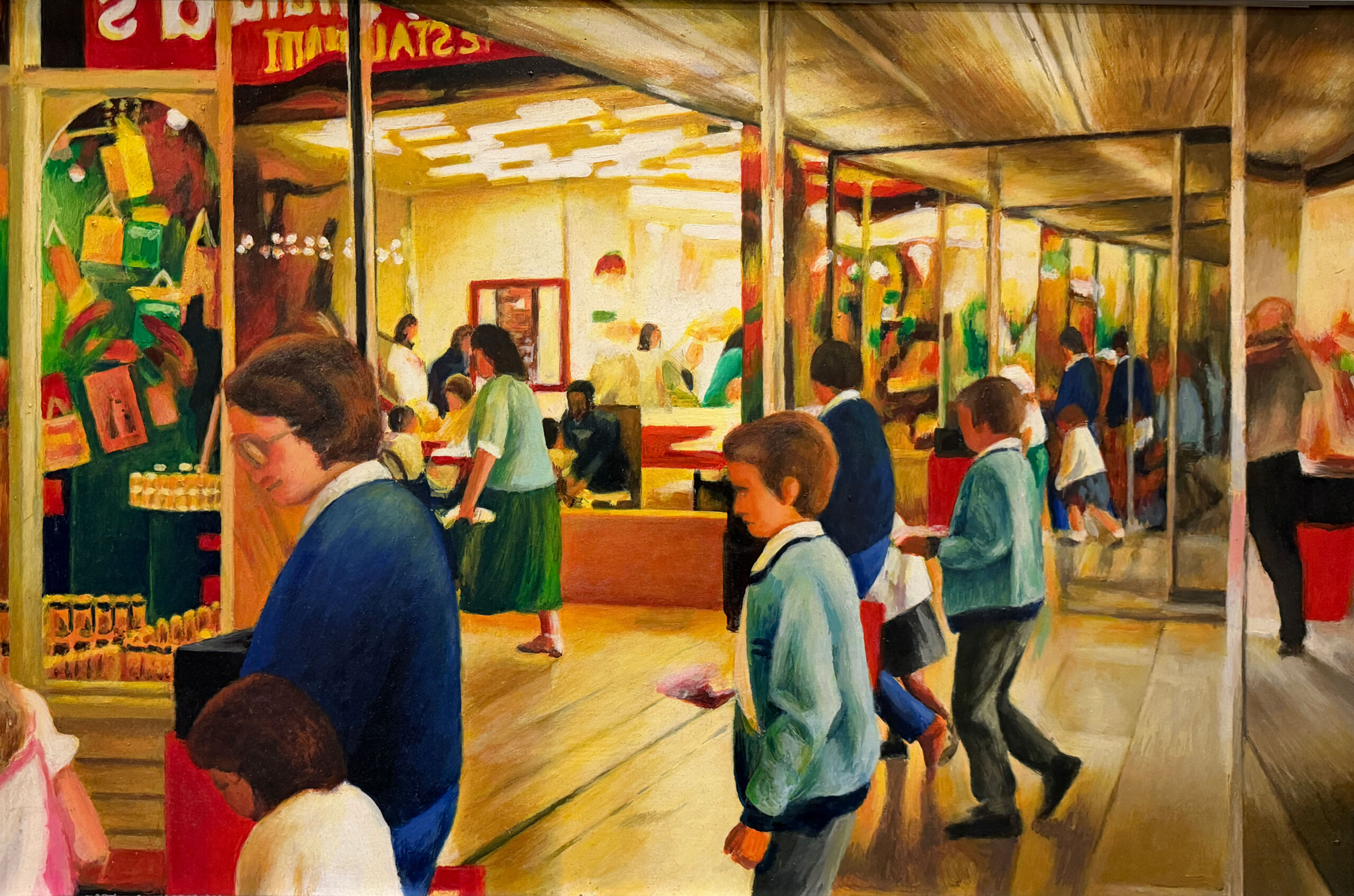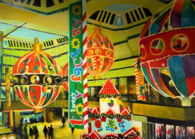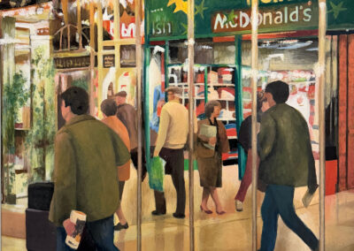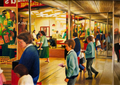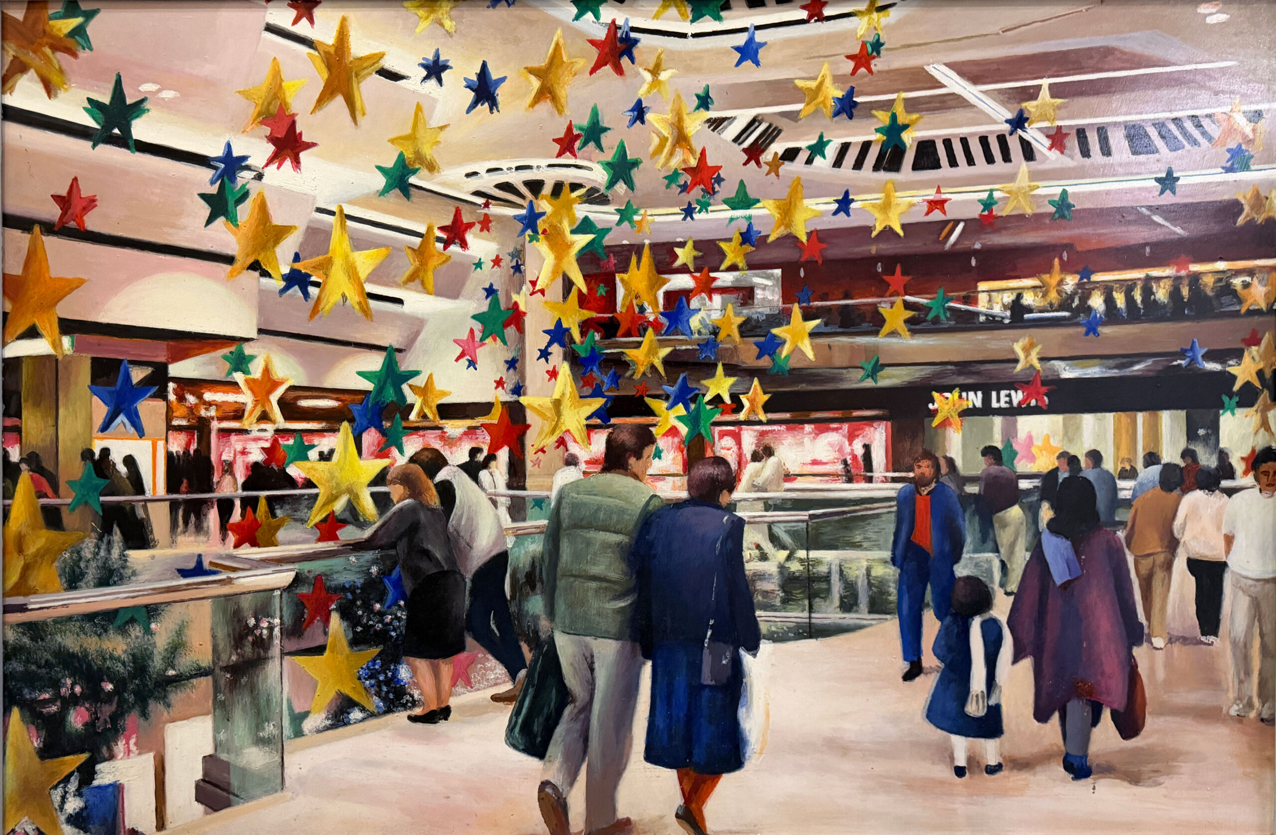 In retirement, he turned fully to his own practice, painting in acrylics, usually working from photographs he had taken himself. These works focus on Queensgate Shopping Centre, capturing its modern design, the play of light and the reflections within the space.