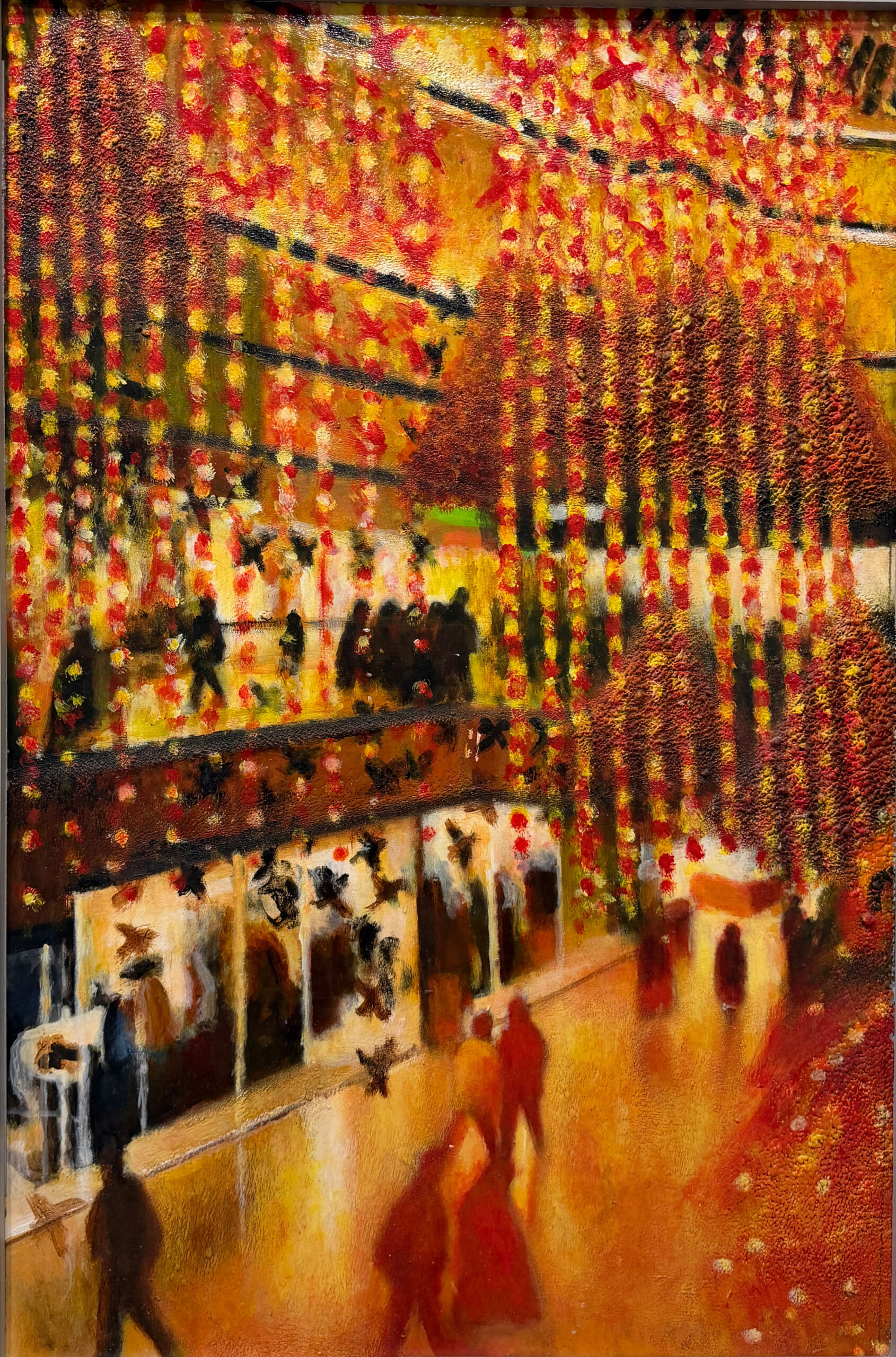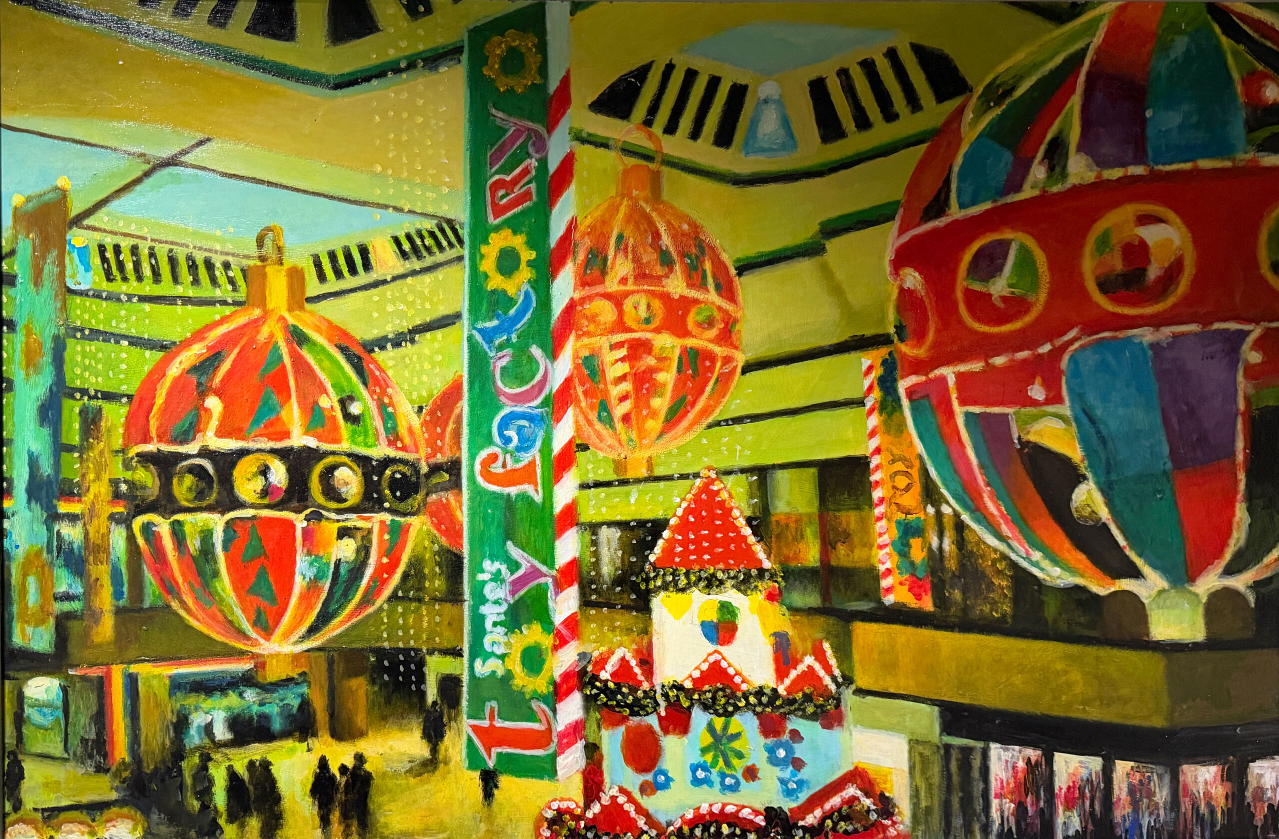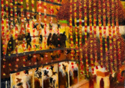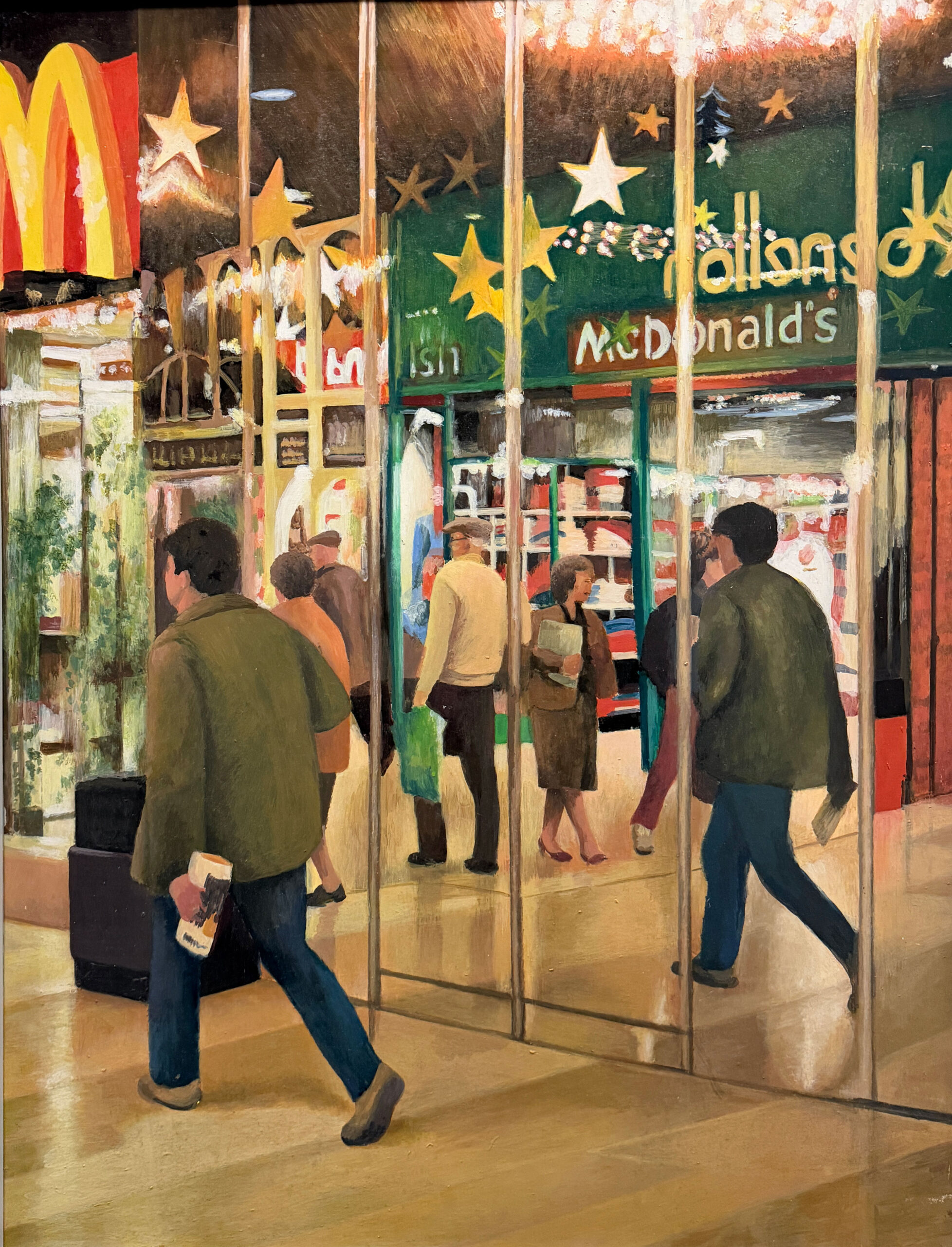 In retirement, he turned fully to his own practice, painting in acrylics, usually working from photographs he had taken himself. These works focus on Queensgate Shopping Centre, capturing its modern design, the play of light and the reflections within the space.